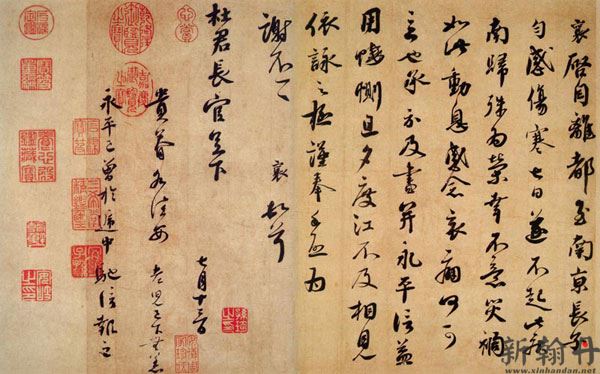 扈从帖蔡襄《扈从帖》(又称公谨帖) 纸本23.3X21.3厘米 北京故宫博物院释文: 襄拜:今日扈从迳归,风寒侵人,偃卧至晡。蒙惠新萌,珍感珍感!带胯数日前见数条,殊不佳。候有好者,即驰去也。襄上公谨太尉阁下。...
