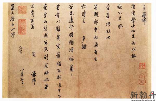 远行帖手札远行帖,纸本,纵31.1cm,横39cm,行书,11行90字 粉花笺本。为北京故宫博物院藏《二札帖》其一远行帖也称修答帖,释文:“仲淹再拜,运使学士四兄:两次捧教,不早修答,牵仍故也。吴亲郎中经过有失款待,乞多谢。吾兄远行,瞻恋增极,万万善爱,以慰贫交。苏醖五瓶,道中下药。金山盐豉五器,别无好物,希.....