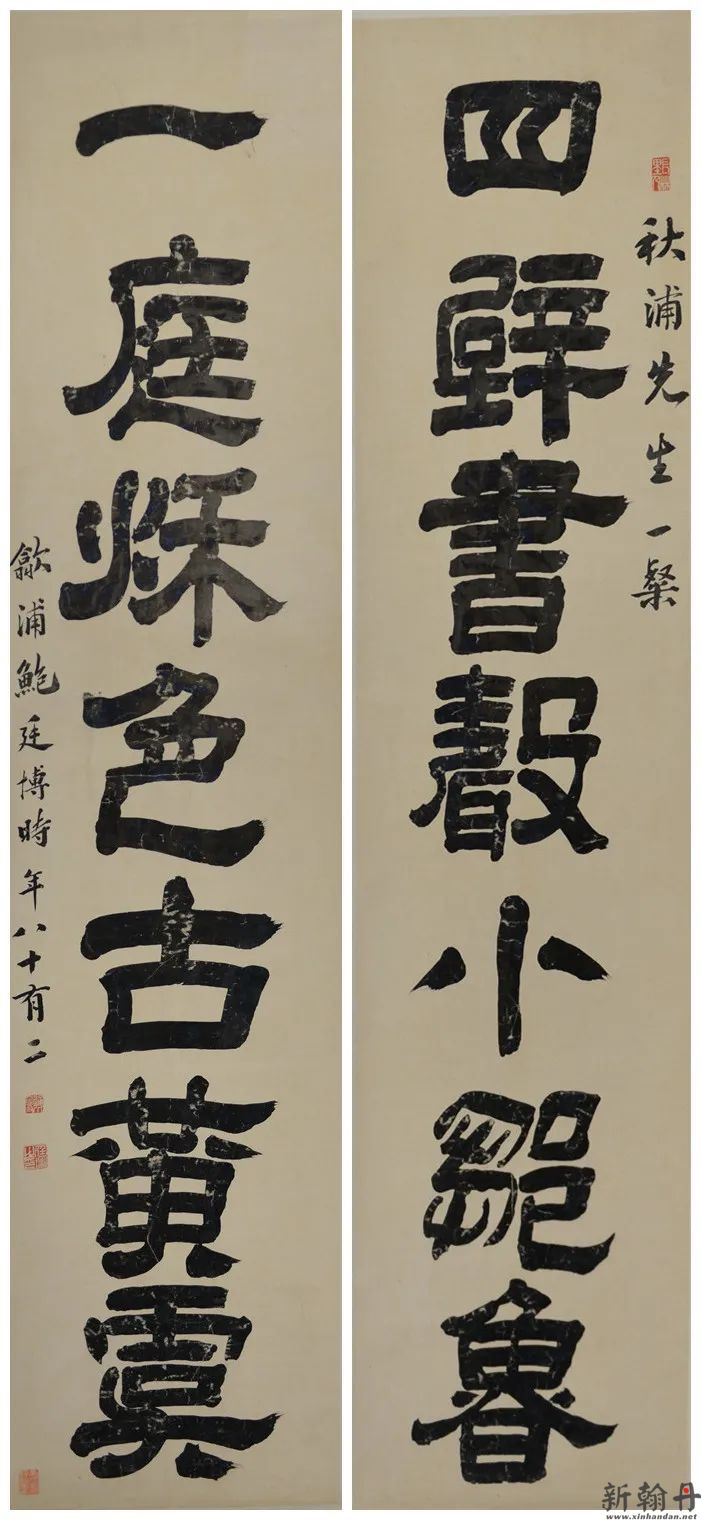 四壁一庭七言联鲍廷博(1728-1814)纸本 隶书纵170厘米 横38.6厘米1809年四壁书声小邹鲁, 一庭秋色古黄虞。鲍廷博(1728-1814),字以文,号渌饮,祖籍安徽歙县,随父鲍思诩居杭州,后定居嘉兴桐乡。秀才,工诗,着有《花韵轩小稿》《咏物诗》等。.....