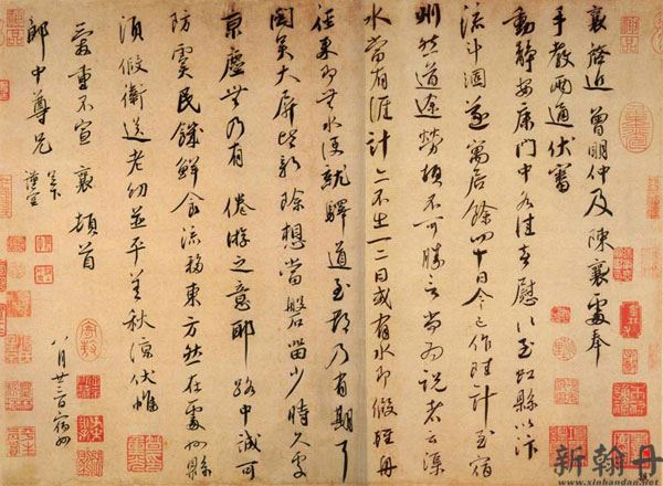 虹县帖蔡襄《虹县帖》尺牍 1051年 纸本 行楷书 31.3 x 42.3cm 台北故宫博物院藏释文:襄启:近曾明仲及陈襄处奉手教两通,伏审动静安康,门中各佳,喜慰喜慰!至虹县,以汴流斗涸,遂寓居。馀四十日,今已作陆计,至宿州,然道途劳顿,不可胜言。尚为说者云:渠水当有涯,计亦不出一二日。或有水,即假轻舟径来;即无水,便就.....
