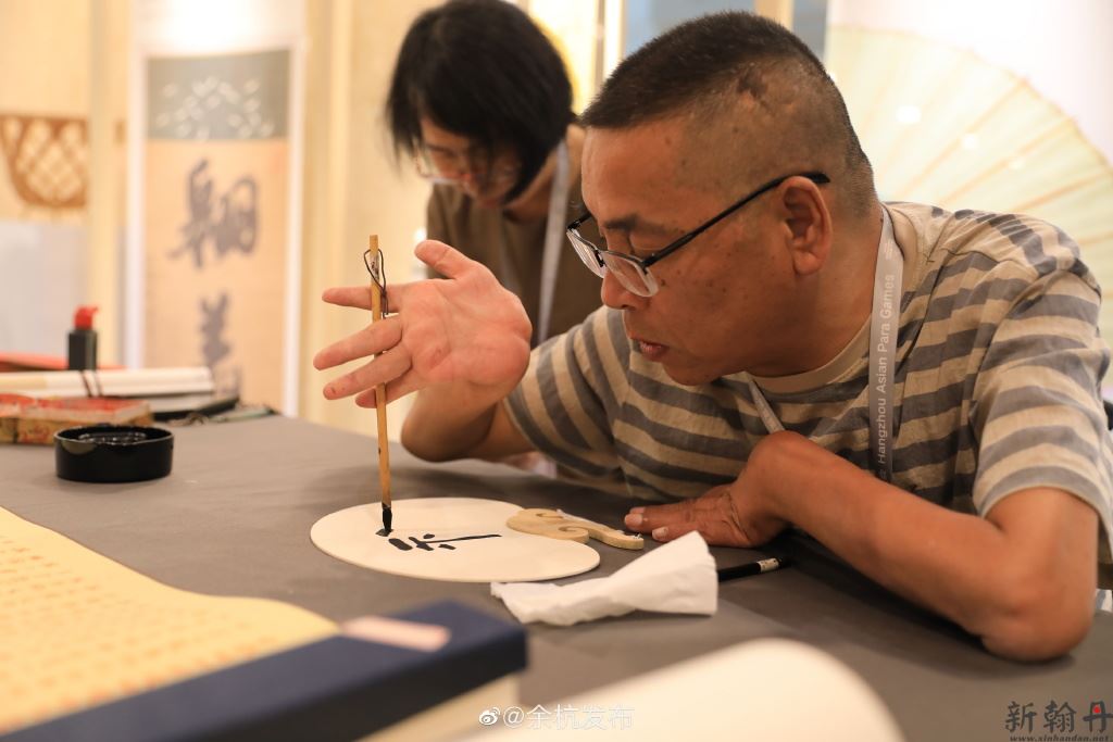 以笔墨赠友邻 余杭书法家亮相亚残运会手工展陈】昨日,杭州亚残运会代表团团长大会在杭州开幕,亚洲45个国家和地区的残奥委员会代表分别通过线上和线下的方式参会。在大会期间的手工展陈活动上,余杭残疾人书法家王渊鹏现场创作书法作品,传递传统杭州元素、余杭元素 .....
