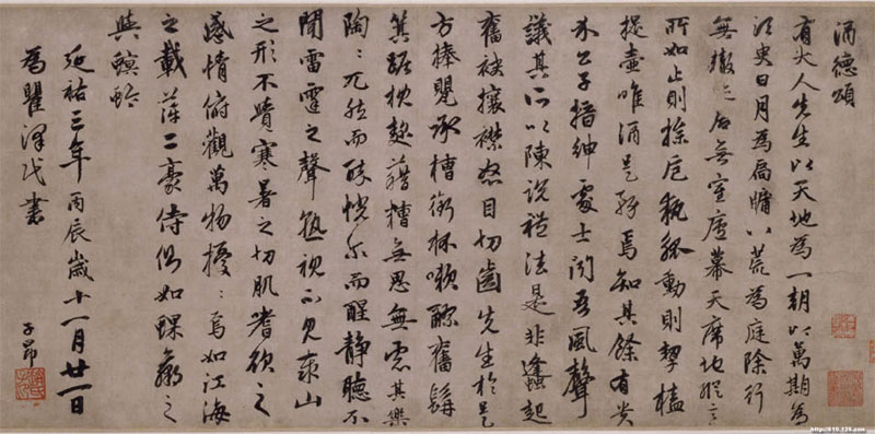 《酒德颂》纸本,行书,纵28.5cm,横65.2cm,19行。 北京故宫博物院藏释文:有大人先生以天地爲一朝,以萬期爲須臾,日月爲扃牖,八荒爲庭除。行無轍迹,居無室廬,幕天席地,縱意所如。止則摇厄執孤,動則挈榼提壺,唯酒是務,焉知其餘。有貴介公子,縉紳處士,聞吾風聲,議其所以,陳說禮法,是非蠭起,奮袂攘襟,怒目切.....