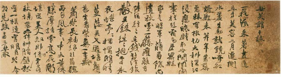 隋人书《出师颂》卷(传为西晋索靖书),纸本,章草书,纵21.2cm,横127.8cm。《出师颂》释文。茫茫上天 降祚為漢 作基開業 人神攸讚 五曜宵映素靈夜歎 皇運未授 萬寶增煥 曆紀十二 天命中易 西戎不順 東夷構逆 乃命上將 授以雄戟 桓桓上將 實天所啟 允文允武 明詩閱禮 憲章百揆 為世作楷 昔在孟津 惟師尚父 素旄一麾 渾一區.....