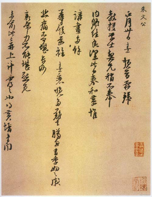 朱熹《致教授学士尺牍》 册 纸 草书 33.1 x 29.3cm 台北故宫博物院藏 这幅“教授学士”尺牍,又称《向往帖》,是以行草书成。由内容中有“长沙新命,力不能堪,恳免未俞”的句子来看,可以推知这应是绍熙五年(1194),朱熹六十五岁时,辞知潭州(今湖南长沙)任的时候所写。这幅尺牍中,朱熹的起笔多.....
