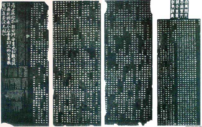 《石台孝经》唐天宝四年(公元745年)立。此碑以四块高各590厘米,宽各120厘米,是唐玄宗李隆基亲自作序、注解并书,李亨篆额。现存陕西西安碑林博物馆孝经亭内。碑文隶书追汉隶风规又小变其法,丰腴爽利,颇有盛唐气概。碑石坚细,至今光莹如漆。《孝经》是孔子的学生曾参纪述他与孔子的问答辞,主要内容讲孝、悌二 字。碑.....