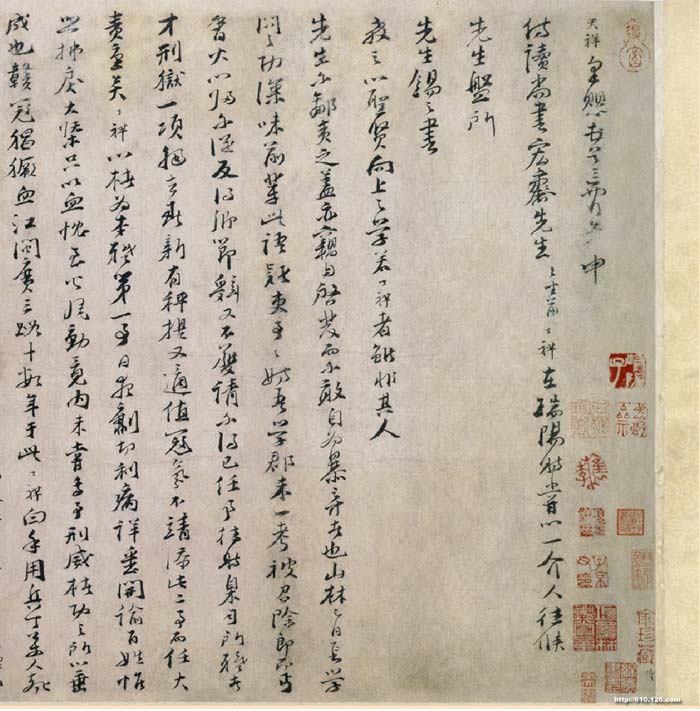 《上宏斋帖》卷局部,北京故宫博物院藏,纸本,手卷,纵39.2cm,横149.9cm,行书,53行,747字。《上宏斋帖》卷释文天祥皇懼頓首。三復□申,侍讀尚書宏齋先生之坐前。天祥在瑞陽時,嘗以一介人往候先生盤所,先生賜之書,教之以聖賢向上之學。若天祥者,雖非其人,先生不鄙夷之,蓋亦竊自啓發,而不敢自爲暴棄者也。山林之.....