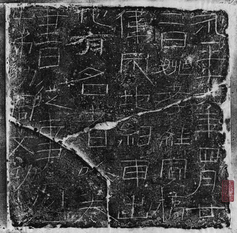 姚孝经墓记,东汉永平16年(73)4月22日,泥质灰陶,边长40、厚5厘米。志文隶书6行,行6-8字不等,共40字。1990年1月出土于河南省偃师县城关镇北窑村东砖厂,现藏于偃师商城博物馆。此志隶书大率为随意刻画,笔画硬直粗率,字体大小不一,但古朴稚拙,自有生气。刻文内容为:01永平十六年四月廿02二日,姚孝经买槁03伟冢地.....