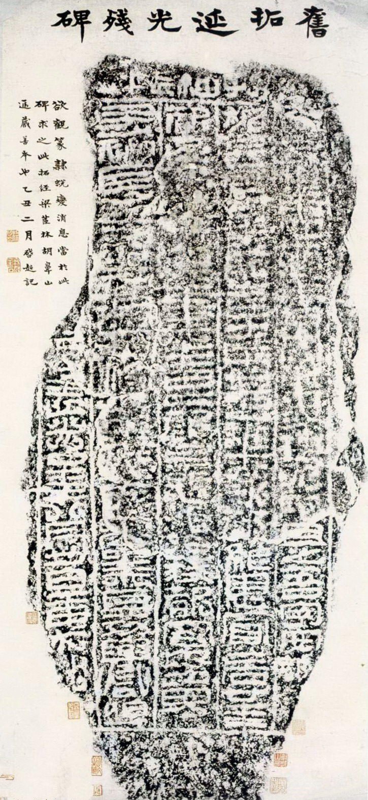 延光残碑又称“都官是吾碑”,纵:104厘米,横:53.5厘米。此为清出土初拓本,首行“是”字左上角稍损,末行“延光”上之“元”字完好。黄易鉴藏,钤“小松所得金石”印。碑立于汉延光四年(125年)。书体非隶非篆,似符印之字,屈曲古劲。康有为《广艺舟双楫》云:“以隶笔作缪篆,亦可附于西汉八分”。碑在康熙六十年(172.....