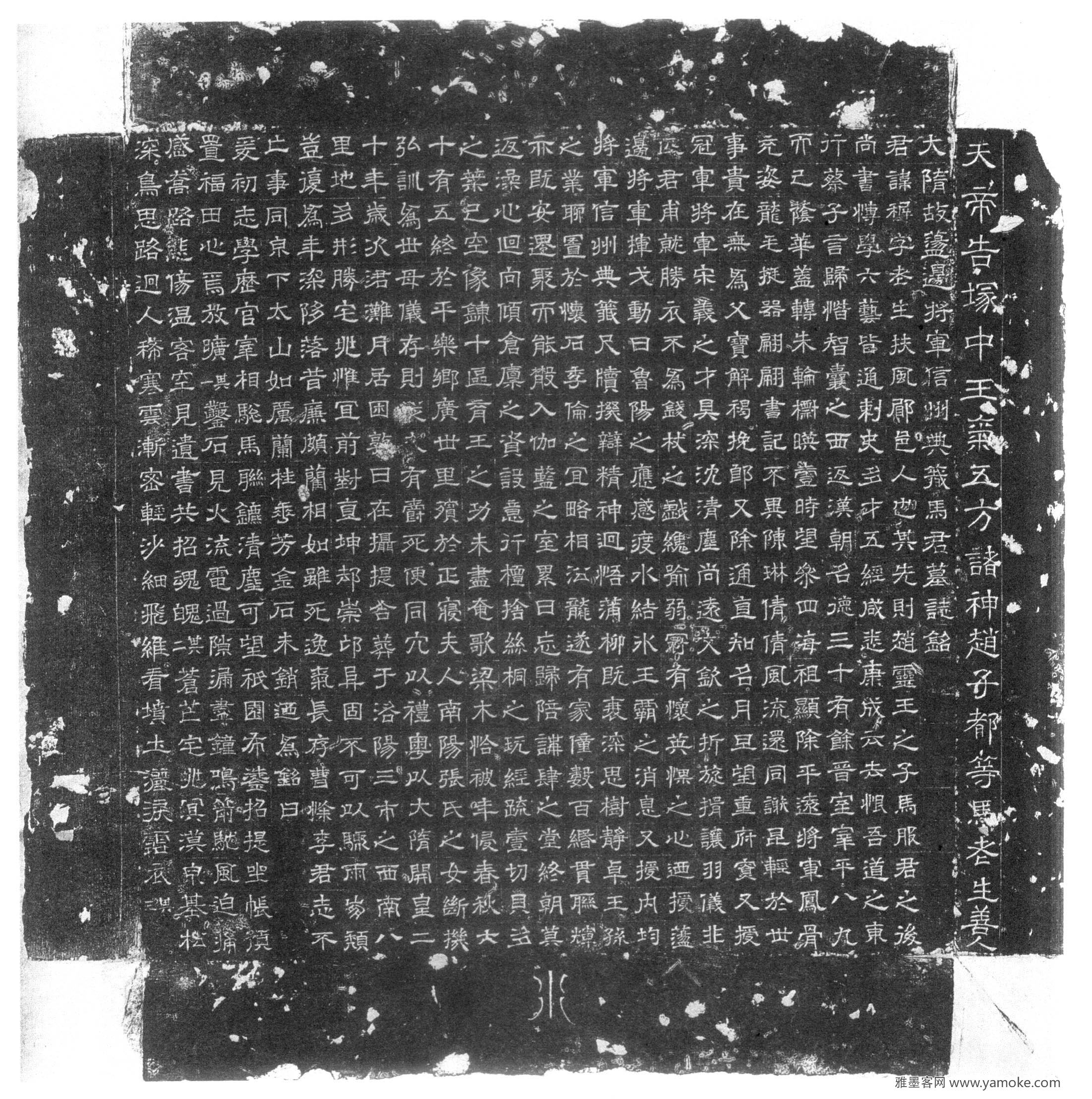 马穉墓志《马穉暨妻张氏墓志》,全称为《大隋故荡边将军信州典签马君墓志铭》。为隋开皇二十年(600)刻。志高51.8厘米、广51厘米。隶书。文25行,行25字。侧1行20字。在河南省洛阳市出土,曾归于右任,今存西安碑林。书法精严秀丽。志左侧称“天帝告冢中王气五方诸神赵子都等马先生善人”20字。志盖作复斗形,盖阳文刻篆书.....