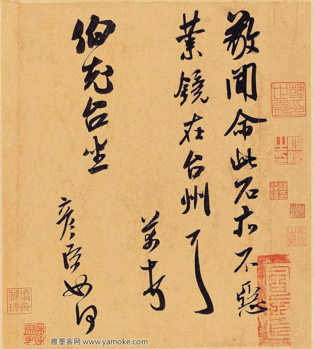 米芾《致伯充尺牍》,翰牍九帖之七,又称《业镜帖》,纸本,行草书,纵23.5厘米,横21.6厘米。台北故宫博物院藏。释文:敬闻命。此石亦不恶。业镜在台州耳。芾顿首。伯充台坐。彦臣如何?...
