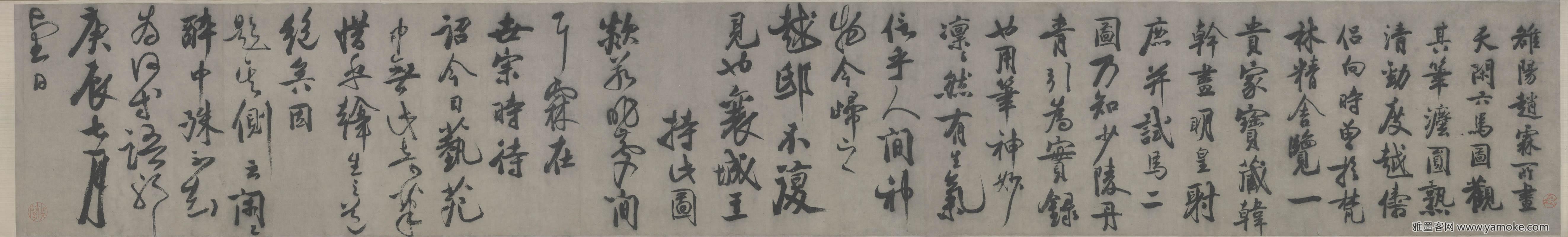 赵秉文 跋武元直赤壁图卷 金赵秉文台北故宫博物院 纸本 卷 墨书 51x387.5厘米释文:追和坡仙赤壁词韵,清光一片,问苍苍桂影,其中何物?一叶扁舟波万顷,四顾粘天无壁。叩枻长歌,姮娥欲下,万里挥冰雪。京尘千丈,可能容此人杰?回首赤壁矶边,骑鲸人去,几度山花发。澹澹长空今古梦,只有归鸿明灭。我欲乘云,从.....