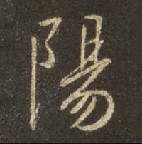 “陽”字在此帖中出现5次,现选取四个有代表性的“陽”字进行分析。1.第一个“陽”字[图 ]①形偏长,字适中。②左耳刀“阝”楷书写法,横折弯钩的第-一个折是方折;竖是垂露竖,方收。③右边“易”是圆转用笔,笔顺连贯。④细节:A.“阝”小,“易”大,用笔左方右圆。B.“易”减省了中间一横,所有王书写“易”字旁皆如此。.....
