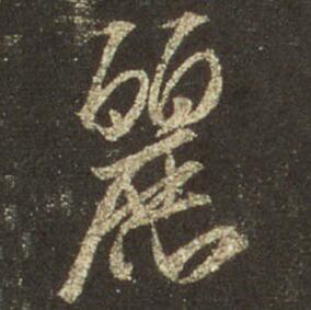 1.形长字大,属草书写法。2.上面的“丽”字圆笔为多、3.下面“鹿”用笔方笔较多,笔画有减省,笔顺有变化:①“广”字旁上点借用了“丽”的右下点,横和撇是方起方收。②“广”里面部分的笔順是:两横连写→两竖→竖钩→竖折撇。“丽”字上下结构。在槽书里是上面占三分之一,下面占三分之二:而在这里,变成了几平各占一半,.....