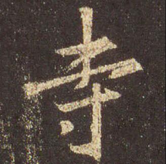 “寺”字在帖中出现两次,写法相同,选取一个进行分析。1.形长字大,方笔为主。2.上部“土”,注意笔顺:先写两横,再写一竖。都是方起方折,方收出锋,尤其第二横长且右上斜度大。3.下部“寸”,类似楷书写法,但横的收笔向左上翻折出锋,映带出竖钩的起笔。竖钩挺拔,出钩有力。注意点的摆放,很有讲究:放在横的起笔处与钩.....