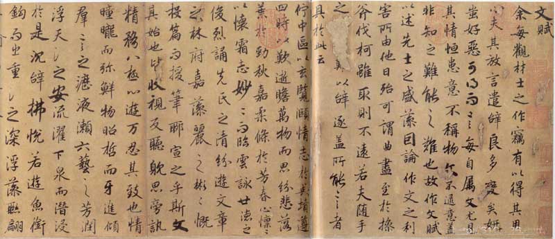 顺便指出一下,此帖偶有于行书中杂写草书的地方,有不协调之感,或许是陆柬之的一种尝试。又正因为《文赋》太似大王书,所以其艺术个性也就显得不强了。《文赋》真迹清时入内府,后藏北京故宫博物院。现藏我国台湾故宫博物院。