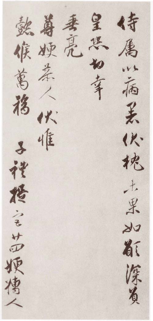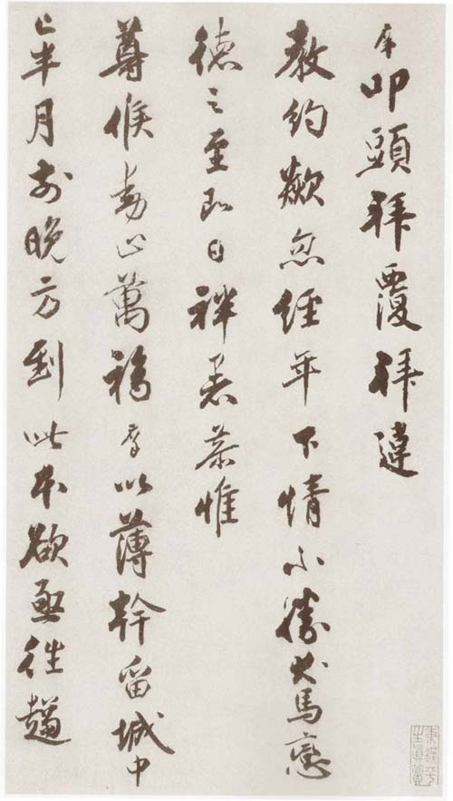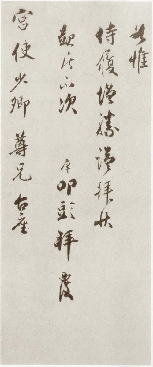 释文:庠叩头拜覆 拜违教约 歘忽经年 下情不胜犬马恋德之至 即日袢暑 恭惟尊候 动止万福 庠以薄干 留城中已半月 前晚方到此 本欲亟往趋侍 属以病暑伏枕 未果如愿 深负皇恐 切幸垂亮 尊嫂恭人 伏惟懿候万福 子礼提宫 廿四嫂孺人 各惟侍履增胜 谨拜状起居不次 庠叩头拜覆宫使少卿尊兄台座