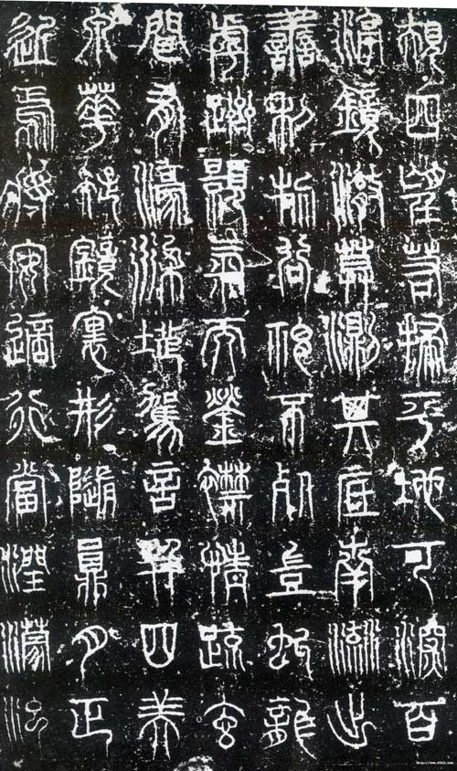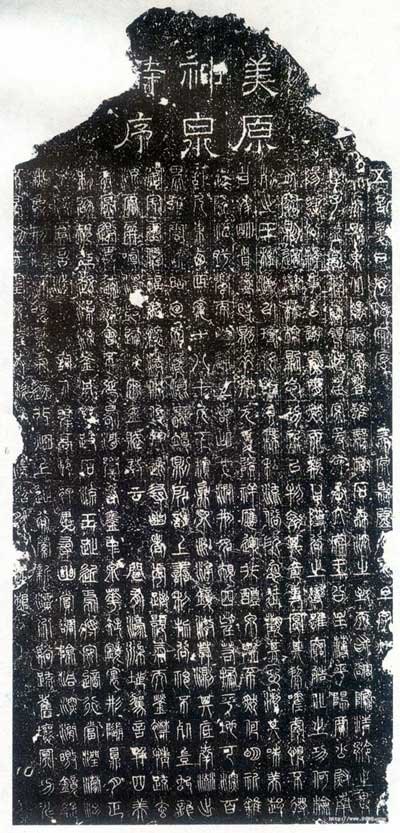 《美原神泉诗碑》 唐垂拱四年( 688年)尹元凯篆书 ,书法峻严,内容歌颂美原县金栗山(今陕西富平县东北地区)中一个所谓的“神泉”。碑收尖形,在唐碑石中少见,疑由汉碑改制。