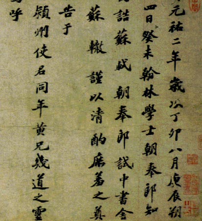 《祭黄几道文卷》,行楷书,纵31.6cm,横121.7cm。1087年。上海博物馆藏。元丰八年6月,苏轼被召回汴京復朝奉郎,后又升至翰林轼读学士、礼部尚书,使东坡生活和政治待遇发生了极大变化。这是他为好朋友去世而撰写的一篇悼文。当时苏轼五十二岁,书风古雅遒逸,真率自然,是苏轼传世作品中极少的楷书珍品之一,历来饱受赞誉。