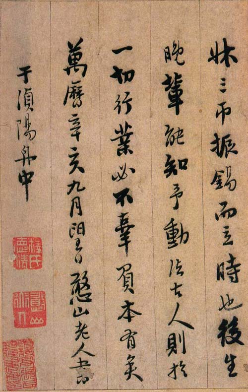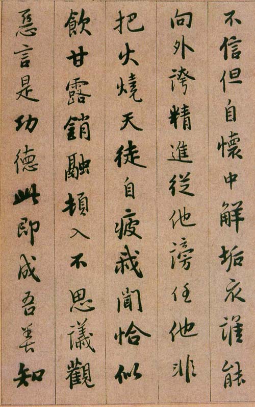 此本内容为性理修养之说,涉佛教。写法上本于王字,不少字的结字与《圣教》相类。然取势用 笔颇有自己特色,与明末书家喜一笔顺势带下,连绵不断的行草写法迥然有别。此本总体的特点是静穆而不乏灵动,端稳而不乏妍美。取行楷法,字字独立以倚侧引势,以大小错落取得变化,以粗细轻重显现节奏。舒展处尽展其势,内敛处不乏其韵。全篇章法总有若干重字以醒目,若干轻字显灵动,通篇取左低右高侧势,款款书来极为自然,一如一股清泉从山间缓缓而下,绝少火气和鼓噪之气,读来如行云流水一般,既有古意又有时趣,古意者取大王儒雅的神韵,时趣者,用小王内擫笔法圆转引带,以消泯火气,不过分追求转折顿挫的变化,因而显得妩媚,当然个别笔画也会显得不很硬朗而有些飘浮。从其取法的角度看,憨山悟性极高,有聪慧之气,所以他的作品前人的影子不多,自己的个性不少,有时还善于在个别点画中以隶意出之,这在妍美的风格上掺和进了一点古拙的意味。