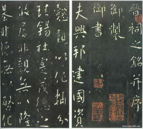 《晋祠铭》全称《晋祠之铭并序》,唐太宗撰文并书。碑高195厘米,宽120厘米。碑额高106厘米,上刻“贞观廿年正月廿六日”飞白书九字。贞观二十一年(公元647)八月刻,碑现存山西太原晋祠贞观宝翰亭内。此碑行书28行,行44字至50字不等。