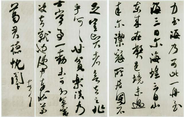 此帖自始至终,气韵十分流畅,下笔如飞,痛快淋漓,毫无顾忌,点画之际,妙趣横生。粗看,“全不缚律”,左倾右倒,形骸放浪。仔细赏读,却又欹正相生,字字随著章法气势变化,用笔狂放而不失检点,提按顿挫丝丝入扣,上下精神,相与流通,有著强烈的节奏感,与其作品比较,此帖颇具魏晋风韵,笔法圆转含蓄韵藉,有篆籀气。节奏也较平和,神闲气定,故能随意布势,妙得自然。