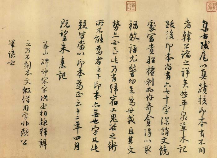 释文:集古跋尾。以真蹟校印本。有不同者。韓公論之詳矣。然平泉草木記跋後。印本尚有六七十字。深誚文饒。處富貴。招權利。而好奇貪得。以取禍敗。語尤警切。足為世戒。且其文勢亦必至此。乃有歸宿。又鬼谷之術。所不能為者之下。印本亦無也字。凡此疑皆當以印本為正云。十二年(1185)四月既望。朱熹記。