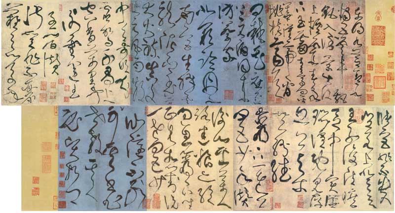 《草书古诗四首》辽宁省博物馆藏,墨迹本,五色笺,凡四十行,一百八十八字。传为张旭狂草之作,极为珍贵。其内容,前两首是庾信的《步虚词》,后两首是南朝谢灵运的《王子晋赞》和《四五少年赞》(疑为伪托)。通篇笔画丰满,绝无纤弱浮滑之笔。行文跌宕起伏,动静交错,满纸如云烟缭绕,实乃草书颠峰之篇。今人郭子绪云:“《古诗四帖》,可以说是张旭全部生命的结晶,是天才美和自然美的典型,民族艺术的精华,永恒美的象征。”(《中国书法鉴赏大辞典》)