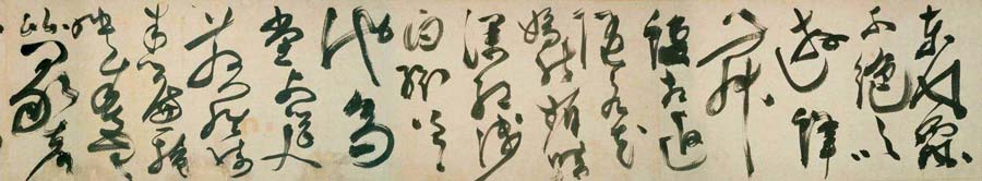 陈淳是晚明狂草大家,开启晚明个性书法的先声。该帖写于1538年(五十五岁),传说是醉后所书,好像作画一般,每行一字至三字,笔墨放纵,运笔提顿扭转,左倾右倒,或节制或奔放,如醉歌狂舞,纵橫争折,线条与墨色交织成不断变动的画面,极富律动的美感。