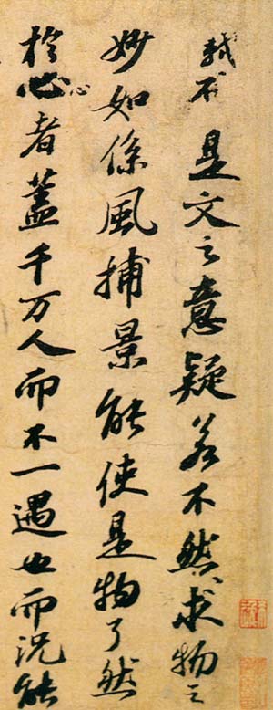 苏轼 《行书答谢民师论文帖卷》纸本 纵27厘米 横96.5厘米,上海博物馆藏。此卷为苏轼于元符三年(1100)冬十二月写给友人谢民师的一封信,谈他对文学遣词达意的见解。现存墨迹已阙文章篇首部分。