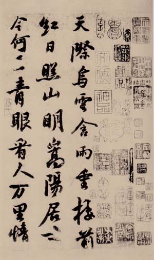 《天际乌云帖》又称《嵩阳帖》,行书,共三十六行,计三百零七个字。此帖无年款,据清翁方纲所考,约在熙宁十年(一○七七》至元祐丁卯(一○八七》这十余年中所书,时苏东坡四十二至五十二岁间。应该说,这是苏氏书法艺术比较成熟时期的作品。