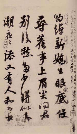 “天际乌云含雨重,楼前红日照山明。嵩阳居士今何(在),青眼看人万里情。”此蔡君谟《梦中》诗也。仆在钱塘,一日谒陈述(古),邀余饮堂前小合中。壁上小书一绝,君谟真迹也。“绰约新娇生眼底,侵寻旧事上眉尖。问君别后愁多少,得似春潮夜夜添。”又有人和云:“长垂玉筋残妆脸,肯为金钗露指尖。万斛闲愁何日尽,一分真态更难添。”二诗皆可观,后诗不知谁作也。