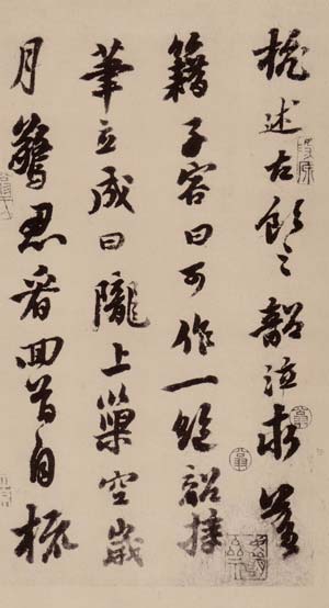 笔力雄厚,却能书写随意;宗法传统,却能时出新意,这是苏氏在此帖中为我们展示的驾驭笔墨的非凡才能。作为尚意书风的主要代表,苏东坡的艺术追求,从来就是强调自我发挥,挥洒性情。他屡屡自道『我书意造本无法,点画信手烦推求气强烈地抒发了一种不为绳缚,崇尚自我和自然的艺术情感。欣赏此帖,能感受到作者从头至尾都处于一个心手双畅,兴到笔随的精神状态。字势的映带关联,字态的率意洒脱,字列的大小错落,都营造出一种顺乎自然的艺术情景。所谓『不矜而妍,不束而严,不轶而豪,萧散容与,霏霏如甘雨之霖,森竦掩映,熠熠如从月之星,纡余宛转,缅缅如萦茧之丝气显现出诗一般的美感。