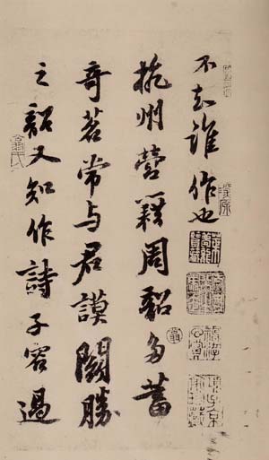 翁氏收藏此帖后,又引起了是否钧填本的争论。因存世苏书钩填本很多,而此帖纸质擦损严重,“有二一描失处”,故疑之。但翁氏肯定说这是真迹本,并将此帖与《快雪堂帖》刻本逐一比较,而断定《快雪堂帖》刻本所据乃为董其昌记载所见之摹本。在没有寻找到更多的证据前,我们尊重翁氏之论,也是有道理的。