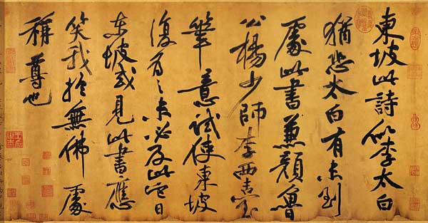 释文:东坡此诗似李太白,犹恐太白有未到处。此书兼颜鲁公、杨少师、李西台笔意,试使东坡复为之,未必及此。它日东坡或见此书,应笑我于无佛处称尊也。