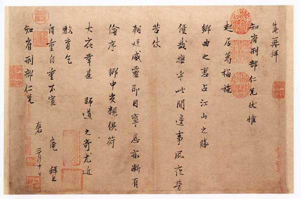 “仲淹再拜,知府刑部仁兄:伏爲起居萬福。施鄉曲之惠,占江山之勝,優哉樂乎。此間邊事,夙夜勞苦。仗朝廷威靈,即目寧息,亦漸有倫序。鄉中交親俱荷大庇,幸甚。師道之奇,尤近教育,乞自重,自重。不宣。仲淹拜上,知府刑部仁兄左右。三月十日。”