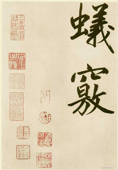 他似乎不经意于每一笔画的精美,而着力于每个字的整体气势与形象的创造。苏轼曾说过:“大字难于结密而无间,小字难于宽绰而有余。”此幅大字称得上“结密无间”,而且越往后写的越好,运笔着墨均达到完美的程度。总体看,此幅大字体势规整,气势恢弘,是鲜于氏大楷书的典型之作。