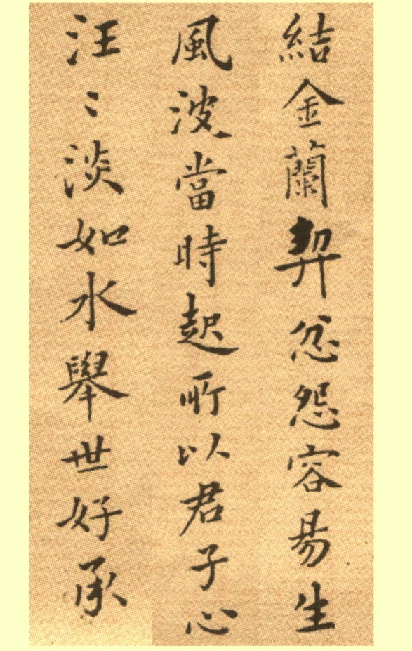 郑板桥在书法艺术上的成就是多方面的,除了他自创的“六分半书”外,他在楷、行、草方面的造诣也颇深,并取得了很高的成就。从目前流传下来的作品看,他确是多体皆精的;他的楷书,不仅艺术成就卓著,也奠定了其书法艺术的坚实基础。郑板桥楷书艺术造诣颇深。《清史列传》称他“书画有真趣,少工楷书,晚杂篆隶,间以画法。”叶衍兰在《清代学者像传》中说:“板桥楷书尤精,惟不多作。”从流传下来的楷书作品看,写得颇有功力,可惜只有为数不多的几件。