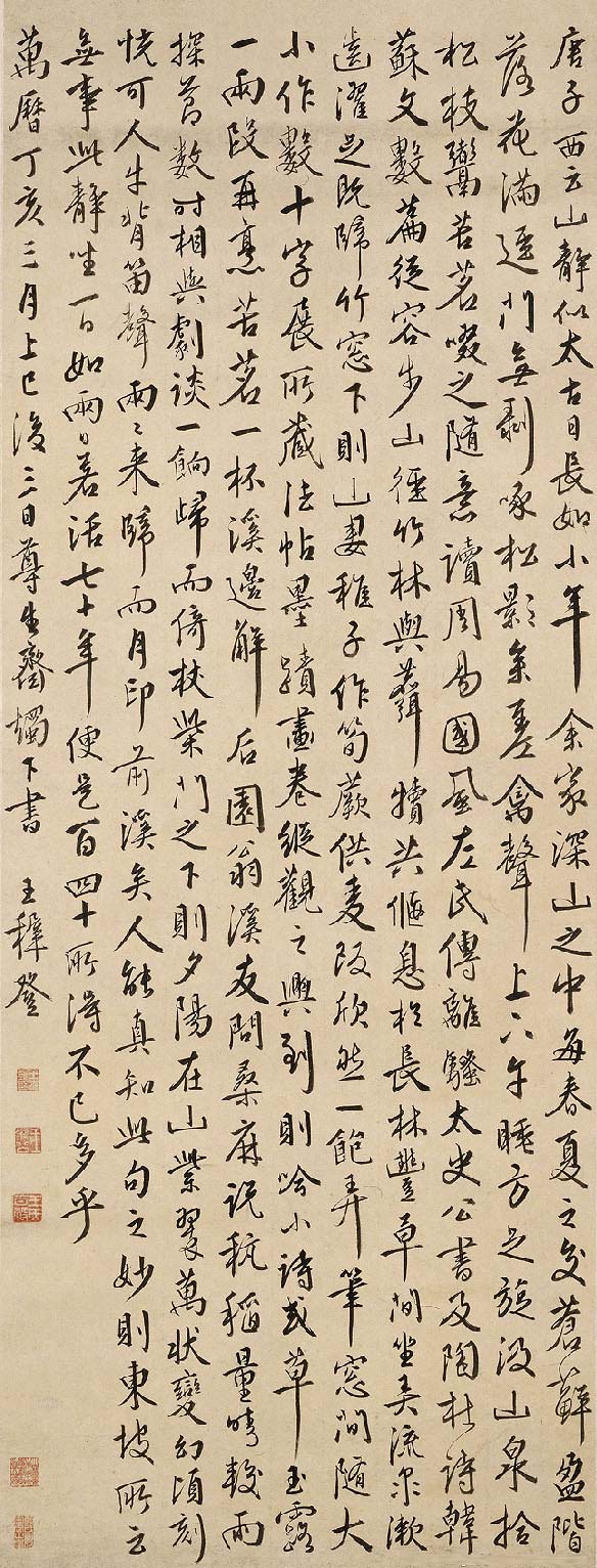 唐子西云:山静似太古,日长如小年。余家深山之中,每春夏之交,苍藓盈阶,落花满径,门无剥啄,松影参差,禽声上下。午睡方足,旋汲山泉,拾松枝,鬻苦茗,啜之随意。读周易、国风、左氏传、离骚、太史公书,及陶、杜诗,韩、苏文数篇。从容步山径,竹林与麛犊,共偃息于长林丰草间。坐弄流泉,漱齿濯足。既归竹窗下,则山妻稚子,作笋蕨,供麦饭,欣然一饱。弄笔窗间,随大小作数十字,展所藏法帖、墨迹、画卷,纵观之。兴到则吟小诗或草玉露一两段,再烹苦茗一杯。溪边邂逅园翁溪友,问桑麻,说秔稻,量晴较雨,探节数时,相与剧谈一饷。归而倚杖柴门之下,则夕阳在山,紫翠万状,变幻顷刻,恍可人(目),牛背笛声,两两来归,而月印前溪矣。人能真知此句之妙,则东坡所云,无事此静坐,一日如两日,若活七十年,便是百四十。所得不已多乎。万历丁亥三月上巳后三日,尊生斋烛下书。王穉登。