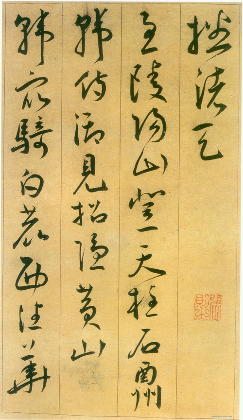 此草书《李白诗卷》。书于戊子(1528)正月十六日,时王宠三十五岁。作品宽二十五点三厘米,长三百一十厘米,为朵云轩藏品。内容为李白五古四首,诗境旷远高迈,意接鬼神,极尽造景抒情之能事。王宠此时书风已自成面目,行笔从容自在,笔势飞动,气脉流畅。落款中称“闲写李翰林杂作”,可见为心手两畅之合作。王宠此作为其草书中之精品,既可作为研究王宠书法之珍贵资料,又可作为学习二王书法之借鉴,他学习王羲之之得(如法严意放)与失(如实多虚少,稍显板滞),对于今天学习书法的人都极具启示意义。