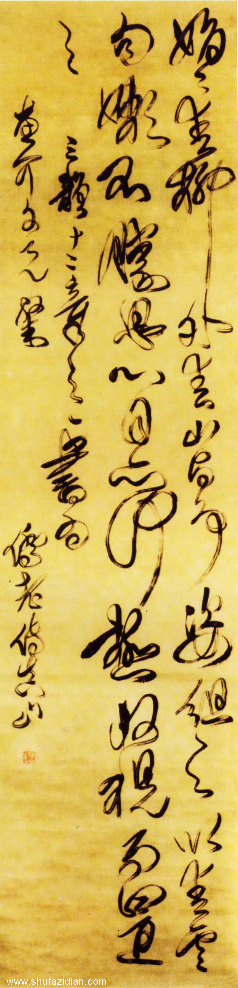傅山《草书五言古诗立轴》,绫本,纵201.5cm,宽50.9cm。北京故宫博物院藏。