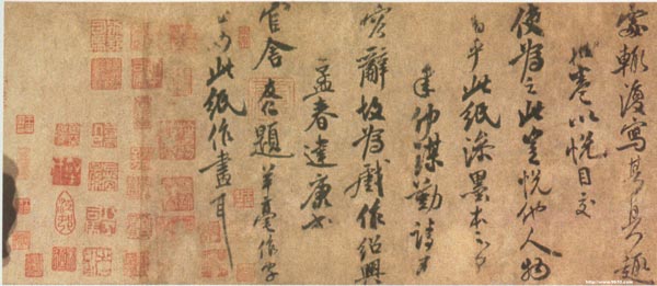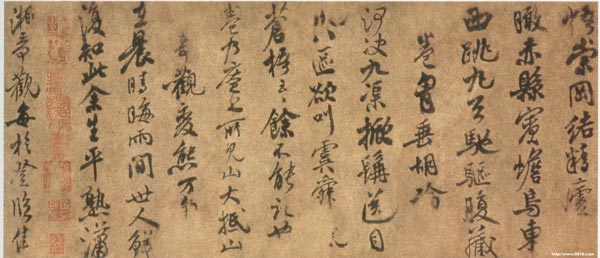 《瀟湘奇观图》是米友仁所绘水墨云山图的代表作品,画幅后又书有题跋一段。据其自言,系用羊毫笔所书,书法丰厚而遒劲。在宋以前的古代书法作品中,用羊毫笔作书的较觅罕见,且能用软笔写出笔划沉著,变化丰富的作品,确能表现出书家的艺术造诣。