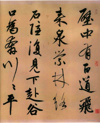 赵孟頫在通常人的眼中是一个气节不全的软骨头,逆来顺受是其性格。其实赵也是一个直率之人。他有诗说:“我性真且率,不知恒怒嗔。俯仰欲从俗,夏畦同苦辛。”(《松雪文集》卷三)徐复观说:“赵松雪心灵上的清,是来自他身在富贵而心在江湖的隐逸性格。”(《中国艺术精神》三八四页)又说:“《重江叠嶂图》为松雪煊赫名迹,王世贞谓其‘冲澹简远,意在笔外。’但虞集的诗却是‘昔日长江险,能生白发哀。百年经济尽,一日画图开。’虞集是能真正了解赵松雪的;并且他也是能领略此一图卷冲澹简远的崇高价值的。可是他更能知道在这种冲澹简远的后面,却是一位‘白发哀’的作者。此后更有明代大画家沈周,也能说出‘还从惨淡见旧物,似有涕泪含孤忠’的话。” (同上书,三七九页)这段话,透彻地分析了赵孟頫为什么画《重江叠嶂图》,以及他在画中寄托的隐逸之思。赵孟頫的思想性格是复杂的,但他抄写东坡诗、临王晋卿画却是寄寓其真性情的。他的画冲澹简远,他的题跋也是随意奔放,简逸澹远。因而,赵孟頫的这幅作品确实是一件难得的佳作,它不但让我们看到了赵书风格的多样、风格的转向,也看见了赵孟頫性格的真率的一面。