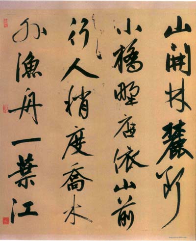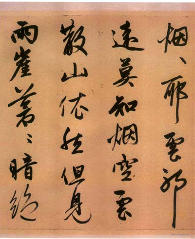 赵孟頫早期的行书,结体俊美,笔意温润婉转,姿态翩翩,这是他对“二王”书风的长期临摹的结果。早期行书如《归去来辞》、《趵突泉诗卷》用笔丰腴,体势扁阔,捺脚较重,而骨力相对稍乏。到大德元年的《洛神赋卷》、五年的《赤壁二赋》,姿态虽然依旧俊美,线条依旧圆润,但用笔的顿挫已大有增强,因之筋骨较为朗健,一些技术的细节更加讲究。如潘伯鹰先生指出的:“如《兰序序》中左右的左字,上面一横接着向左一挑,接处提笔向上翻出一个小圈,在《兰亭帖》中本不甚显。由于他细心学出, 他特意强调将翻笔的圈儿写大一些。”(《中国书法简论》一三二页)“ 有”、“右”、“雄”这些字都有这个特色。到了大德六年,《吴兴赋》的用笔更加爽健,顿挫有力,筋骨与姿态均达到新的高度。故大德七年的赵书诗跋,是沿着书风的这一转向而来。它的风格特征有如下几个特点:一是用笔爽朗、奔放,横画劲健,撇捺爽利,甚至有较为夸张的线条出现,如第三行两个“耶”的竖笔,不但极有气势,且骨力强健。第七行的“断”字,一字占了几字的位置,这在赵书中是极为罕见的;二是结体向纵势发展,不再扁阔。这个体势的变化,也反映出柔媚书风向雄放劲健书风的转变;三是节奏力度的加强,也一改过去轻重均匀、行笔虚和的局面。由于纸幅比赵孟頫惯写的横幅高度大,每个字的字形也极大,有小儿拳大。故字形大小、笔画粗细出现了新变化。大小错杂悬殊很大,枯润交替,因而节奏强烈。全幅出现奔放、热烈的节奏,第一行七字,第三行只四字,多处枯笔缠绕,苍涩有力,故有沉著中的痛快。这与过去的作品拉开了距离,与极晚年的《与山巨源绝交书卷》相仿佛。由于赵书的这几个特点,让我们看到了赵孟頫书法的又一种面貌。 <