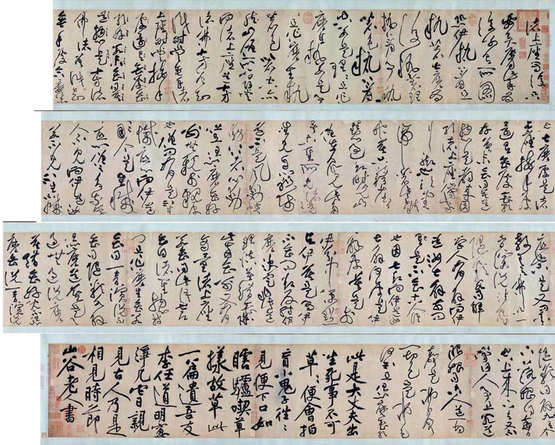 此卷是黄庭坚为其友李任道抄录的五代金陵释《文益禅师语录》,是其草书精品之一。此卷为山谷晚年代表作,深得怀素草书遗意,如龙搏虎跃而又圆婉超然,纵横之极,而又笔笔不放,取势侧欹,左右开张,墨色枯润相映,布白天趣盎然,可谓气势豪迈,超凡脱俗,似有禅家气息。黄庭坚《山谷自论》云:“余学草书三十余年,初以周越为师,故二十年抖擞俗气不脱,晚得苏才翁、子美书观之,乃得古人笔意。其后又得张长史、僧怀素、高闲墨迹,乃窥笔法之妙。”在《语录》后黄氏又作大字行楷书自识一则,结字内紧外松,出笔长而遒劲有力,一波三折,气势开张,一卷书法兼备二体,相互映衬,尤为罕见,是其晚年杰作。明都穆《寓意编》、华夏《真赏斋赋注》、文嘉《钤山堂书画记》、张丑《清河书画舫》、《清河见闻表》、卞永誉《式古堂书画汇考》,清孙承泽《庚子消夏记》、清内府《 石渠宝笈·初编》等书著录。