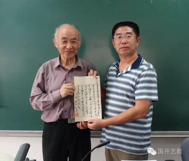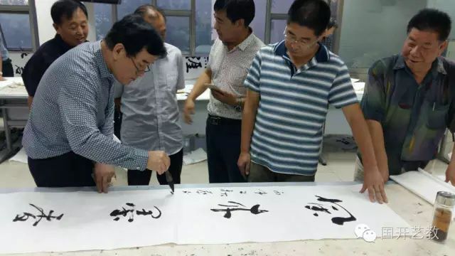 ,上课正式开始,蔡民基院长亲自担任主持。尽管蔡院长不是专业主持,但因为出身行伍相貌堂堂举止文雅个性亲切,知识丰富语言生动又不失严谨,遣词造句出口成章信口拈来,语调随性随意温暖温润,让我们课前及时准确地获取了各位老师的经历阅历成就等大量信息;课后的总结发言又准确自然切中主题给人启迪,因此课堂气氛活跃热烈,从来就没冷过场。 田伯平老师正在授课 中国传统的书法艺术是一门理性的艺术,它贯穿的是书家极强烈的秩序感和纪律感。“书苑点睛”班的举办显然是成功的,每次上课,五十多位书道同仁绝没有人喧哗,更没有人提前离开,反而旁听的人数在不断增加,这当然是出于对大师们的尊敬和聆听。每一位老师都是个性亲切自然,打扮端庄得体,言谈举止雍容华贵,待人接物谦逊有礼,浑身上下举手投足彰显高贵气息,给我极其深刻的印象。听各位老师讲课,惊喜再一次如起伏的山峦连绵不断,处处闪耀着智慧的光芒和思维的睿智,使我更加深刻理解了“书道即人道”的道理。整个讲课随着老师的读书、创作和做人徐徐道来,各位老师以其深厚的艺术功底、严谨的材料布局、娴熟的语言技巧及厚重的人文情怀,从书法的由来到变迁,从书法在哲学中的体现到笔墨的和谐统一,从书法界的典故逸闻到传承过程的弘扬……语言幽默风趣,表情自然亲切,知识洋洋洒洒,让人受益匪浅,沉浸其中常感意犹未尽…… 刘臣副校长和蔡民基院长为学员颁发结业证书 比如申万胜先生。初见申先生的一刹那,我的眼睛都直了,是真的吗?虽然多次在电视里的众多文化活动中见过申先生出席,但现在远远看他被众星捧月般簇拥着,想我一个无名之辈挤不上前,但高山仰止景行行止诚慌诚恐之感还是油然而生。瞧着先生沉沉稳稳地从门口直直走过来,心里竟然有些慌了,该怎么办呢?只听不知谁一句“申夫先生来了,鼓掌啊!”才紧张的跟着鼓起掌来。申夫先生笑微微扬手道:“哦,谢谢大家。”就这简单的几个字,在我,却如雷贯耳,激动和感慨进一步激荡着原本就不能平静的心,同时又添了一些甜丝丝的情绪,好像有一股强大的动力,鼓励我面对专家学者,书道同仁,开始我的学书经历和心灵历程。课堂上的申先生哪里像个古稀老人啊,思维敏锐,反应快捷,言谈风趣,铿锵有力,举止优雅,特别是字字珠玑的幽默和豁达,形成一股强大的气场,令所有学员心服神折,这就是大师的处世态度和人格魅力吧。课间休息找老师交流,看到老师随和的笑容,顿时感到老师像父亲一样亲切,这不是高攀啊,面对面时老师慈祥的目光,让我心里生出温暖的亲情,洋溢着,扩展着。申先生像慈祥的父亲一样,娓娓道来,丝毫没有俯就感,更没有一点教训的口吻,叙家常一般,让我由战战兢兢逐渐放松下来,向先生汇报了单位开展文化活动的一些情况,谈了自己才疏学浅知识浅薄一直心存自卑等问题,先生很认真地想了一下说,你们开展的活动,还是很有意义的;有自己的观察,体验,思考,感受,足够了;也许有的人聪慧一点,悟性快些,可以更快地进入状态,但功夫下了多少是骗不了行家的,坚持下去,才有创新和启发。课程结束后合影留念时,大家担心先生年高体累,希望他坐下来,但他依旧站着并俏皮地说,今天我是你们的背景,一个个来吧。大家紧张的心情一下放松下来,我紧紧握一握先生的手,开心的跟先生站着合影,果然神彩跟往日迥然不同,我想,这是先生给予的,虽然他可能不知道影响的作用有多么巨大和深远,但真真就是从那个时候起,我的自信心有了突飞猛进的提高,因为先生给了我勇气和鼓舞。 蔡民基院长课余为学员示范书法 书家从临碑习帖时就在接受着节制欲望和情感的训练,就在接受着秩序和纪律的教育,就在这一过程中,一种不浮躁不外露,沉稳老练的道德人格便培养了起来。虽是仅仅5天的学习,但在老师的教导下,同学们源于碑帖传统,又对传统书法与现代书法进行了重新拷问定位,极力地汲取传统书法的精髓,追寻现代书法的创作观念,结合自己的习书经历,从多个方面对书法进行了阐释,在传统书法与现代书法的和谐中,以自我形成的笔墨风格和书写形式跳动着让人心动的“墨舞”。5天的名师解读,也让我猛然意识到自己先前的浅见和自以为是多么可笑!实际上我是一直不求甚解啊。通过学习,让我重新审视了自己,真的感受到学海无边自己知之甚少,需要从看似简单的“点画”开始,潜心学习,深入探究。所以,我将以“书苑点睛”班入门,更需从“点画”开始,脚踏实地,虚心向各位老师、同仁学习,在国家开放大学和芸芸社会这所大学校里不断汲取营养,期待人生的华丽绽放! 宫义和与研修班同学合影留念 当爱好只是爱好,艺术才更纯粹。首届“书苑点睛”班已经结束,共同的爱好让我们走到一起,也圆了我们痴爱书法艺术的梦想。作为其中一员,我深感骄傲和自豪,却又有着一种惴惴不安: