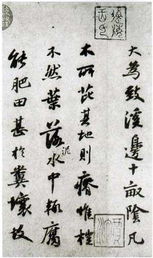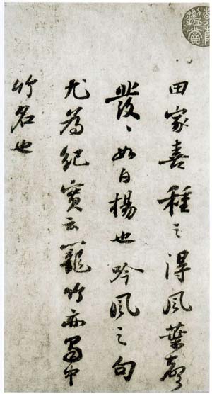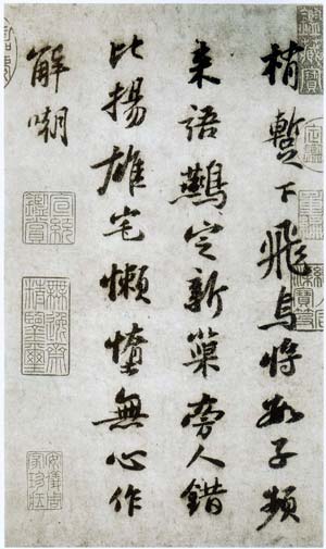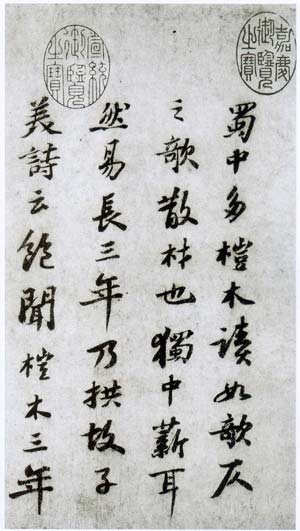 此帖多用正锋,精神凝聚,结构圆熟,字形匀称,其墨法最有特点。安岐评论说:“此卷字画沉着,用墨浓淡适中,较丰墨者别有生动之趣。”明代金冕跋云:“昔先生尝赞美杜子美诗、颜鲁公书皆求之于声律点画之外,今观先生书杜诗,后千百年,宛然若昨日挥洒者,盖寓精神于翰墨而才品所自到尔。倘拘以宇宙之得而论之,是未可同赏妙也。”在这短幅中,苏轼以其笔墨骨肉赋其形,以其才学品性灌注其神情生气;吟物有所寓,咏诗有所悟,读杜有所思,挥毫有神助,使后人“爱玩不忍舍”。