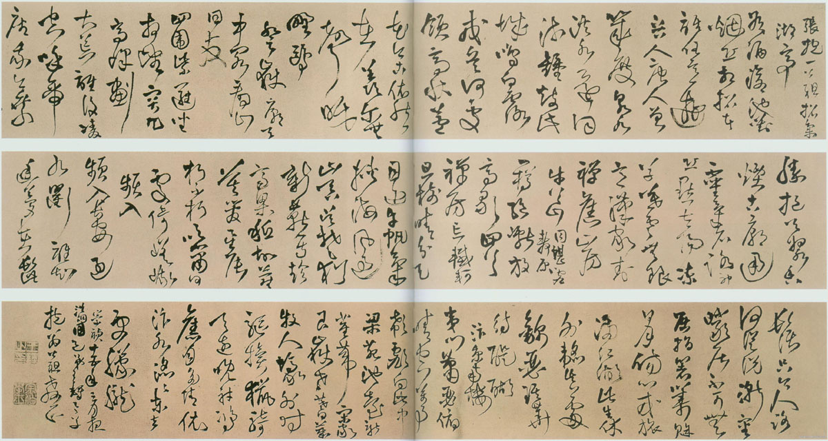 王铎《赠张抱一草书诗卷》自署书于崇祯十五年(1642)。绫本。草书。自作诗七律五首·凡七十五行,共3636字。长469cm,高26cm。日本东京国立博物馆藏。