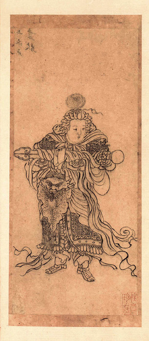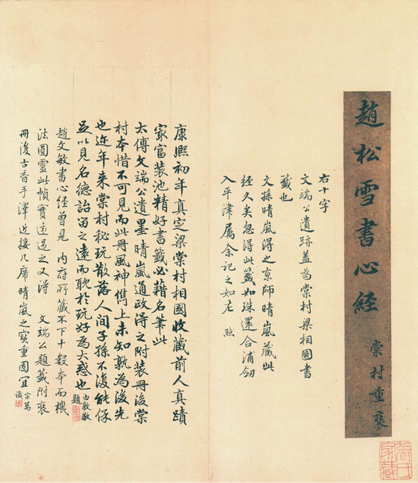 《心经》册页装,3开。第1开前1开,是白描观音大士像。第3开后第1开.是白描韦陀像,后面第2—3开是明王稚登、清张英、张照、励宗万等人跋和原梁清标题签。每单开纵288厘米,横108厘米。此册原为清张若蔼旧藏,有“炼雪鉴定”、“晴岚居士”等印。乾隆时入清宫,有乾隆、嘉庆、宣统内府藏印。《心经》原为手卷,入清宫后改为册页,并加装檀香木雕花夹板。《心经》前后的《观音像》、《韦陀像》是清人所绘。著录于《秘殿珠林续编》。