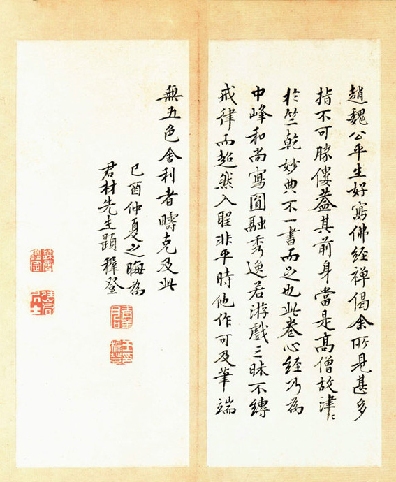 这册《般若波罗蜜多心经》是赵孟頫的一件代表作品。它运笔自如,清润流畅,自成面貌,但细分析起来,却又感觉它笔笔字字都自有来历。我们知道,宋代书画艺术到南宋末年已走向衰退。马远、夏珪末流的画风,大多空阔粗疏,韵味全无。书法也早已失去了北宋的生动神韵,传世的赵孟坚《自书诗帖》、文天祥《木鸡集序》,都说明了这种情况。生活在这一时代的赵孟頫,力图矫正时弊,有所作为。如同中国历史上常见的托古改制一样,他在书画上,也以提倡“贵有古意”,来振兴颓势。在书法上,他用心临摹钟繇、王羲之、王献之、智永的字帖,力求从魏晋人的作品中吸取营养。但宋末元初时,已没有东晋人那种以玄风为背景的风韵。赵孟頫临摹的拓本字帖,与钟、王、智永原写本的神采也已有距离。这样,赵的书法也只能是古人的影子,而不可能是古人的再现。加之晋人席地而作、悬空书写,与元代端坐高椅、据案书写的姿势截然不同,书写效果判若有别。这样,赵孟頫虽主观上追摹古人,而实际上却产生了一种貌似古人的新的书风。赵孟頫一心尊古、规模古人点划的临帖方式,对明清以来的书学影响很大。至于他借鉴行书的笔法与小楷的结体来写大楷,创造出一种别于欧、柳、颜体刚性楷书的柔性赵体楷书,则因其适应性强,大可书写匾额,小可誊录殿试大卷,影响就更大,试看元代刻书一律通行赵体,就可知赵字的风行程度了。