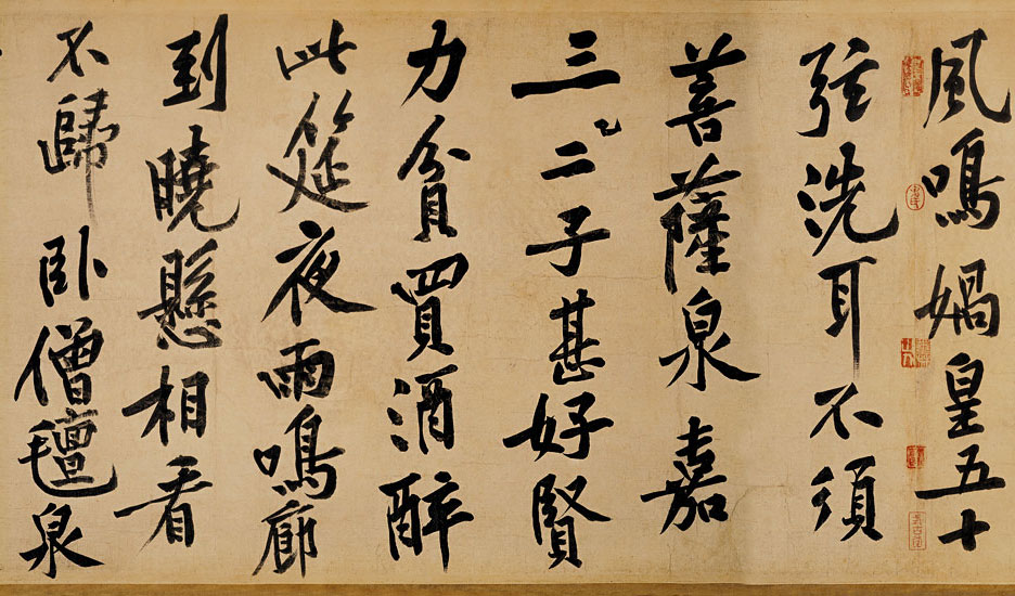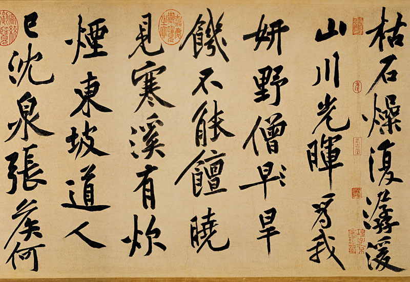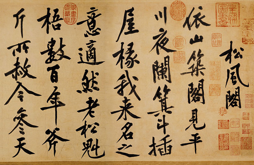 崇宁元年(1102)九月,黄庭坚与朋友游鄂城樊山,途经松林间一座亭阁,在此过夜,作了这首“松风阁”的诗,歌咏当时所看到的景物,并表达对朋友的怀念。这件书迹长波大撇,提顿起伏,一波三折,像是船夫摇桨用力的样子。不论收笔、转笔,都是楷书的笔法,下笔平和沉稳,变化非常含蓄,轻顿慢提,婀娜稳厚,意韵十足。在后段提到前一年已去世的苏轼时,心中不免激动,笔力特别凝重,结字也更加倾侧,传达出与东坡笃厚的情谊,是尚意书风的典型。